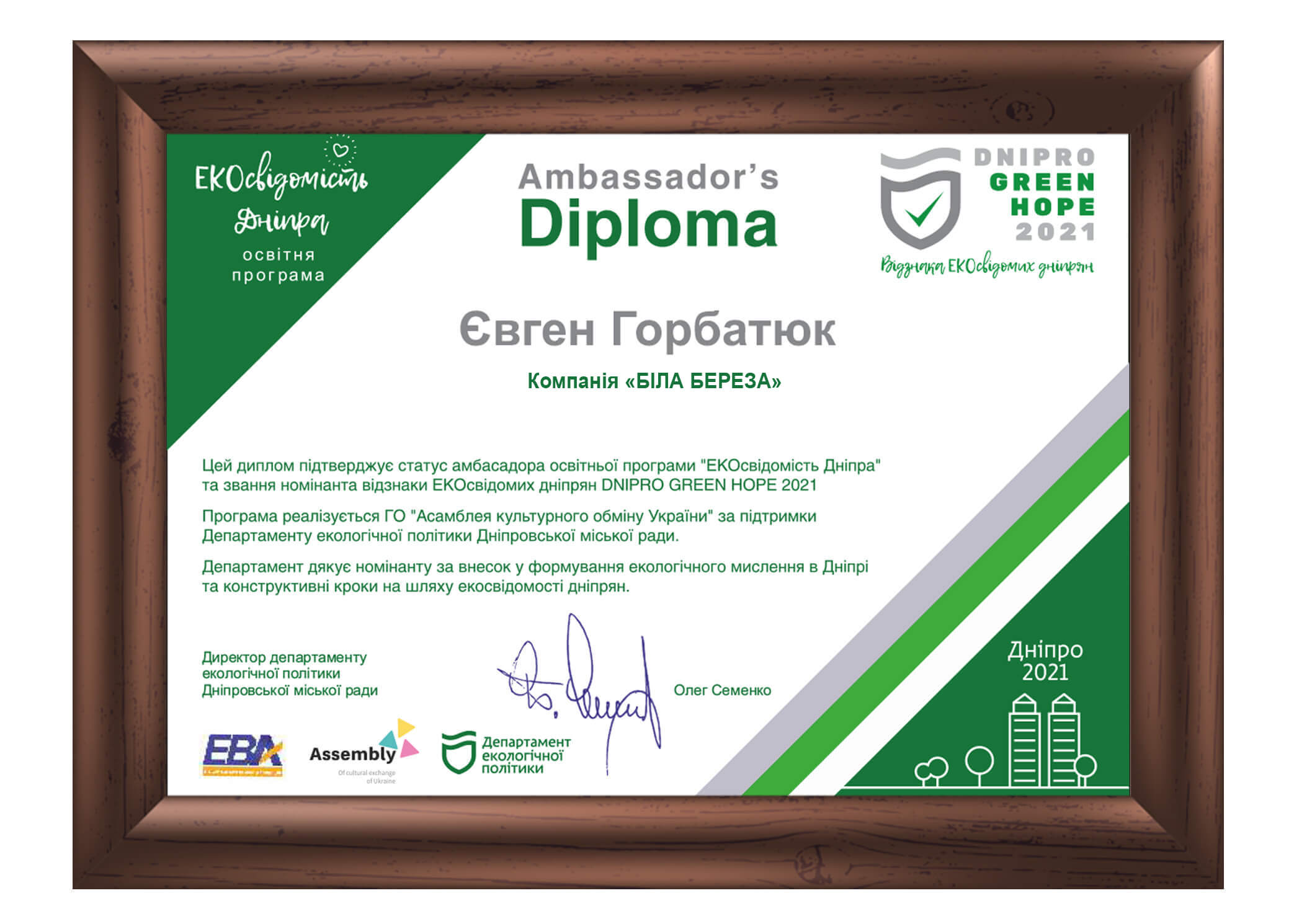 Екосвідомий бренд: «Біла Береза» отримала диплом Dnipro Green Hope 2021